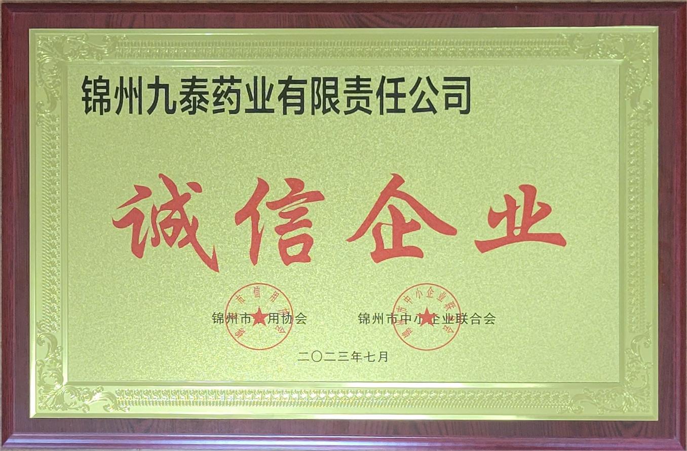 717,在錦州市中小企業(yè)聯(lián)合會(huì)、錦州市信用協(xié)會(huì)誠(chéng)信會(huì)員企業(yè)表彰大會(huì)上,錦州九泰藥業(yè)有限責(zé)任公司命名為“誠(chéng)信企業(yè)”榮譽(yù)稱號(hào)。